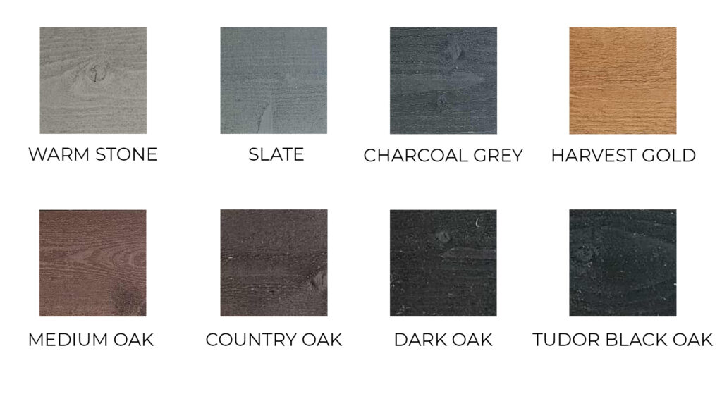 - Spalvų pasirinkimas: WARM STONE, SLATE, CHARCOAL GREY, HARVEST GOLD, MEDIUM OAK, COUNTRY OAK, DARK OAK, TUDOR BLACK OAK ar jūsų pasirinkta individuali spalva.